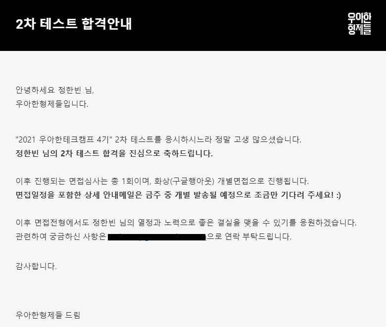 친구가 지원하길래 재밌어 보여서 지원했던 우아한 테크캠프의 2차 코딩테스트 합격 이메일이 날라왔다.